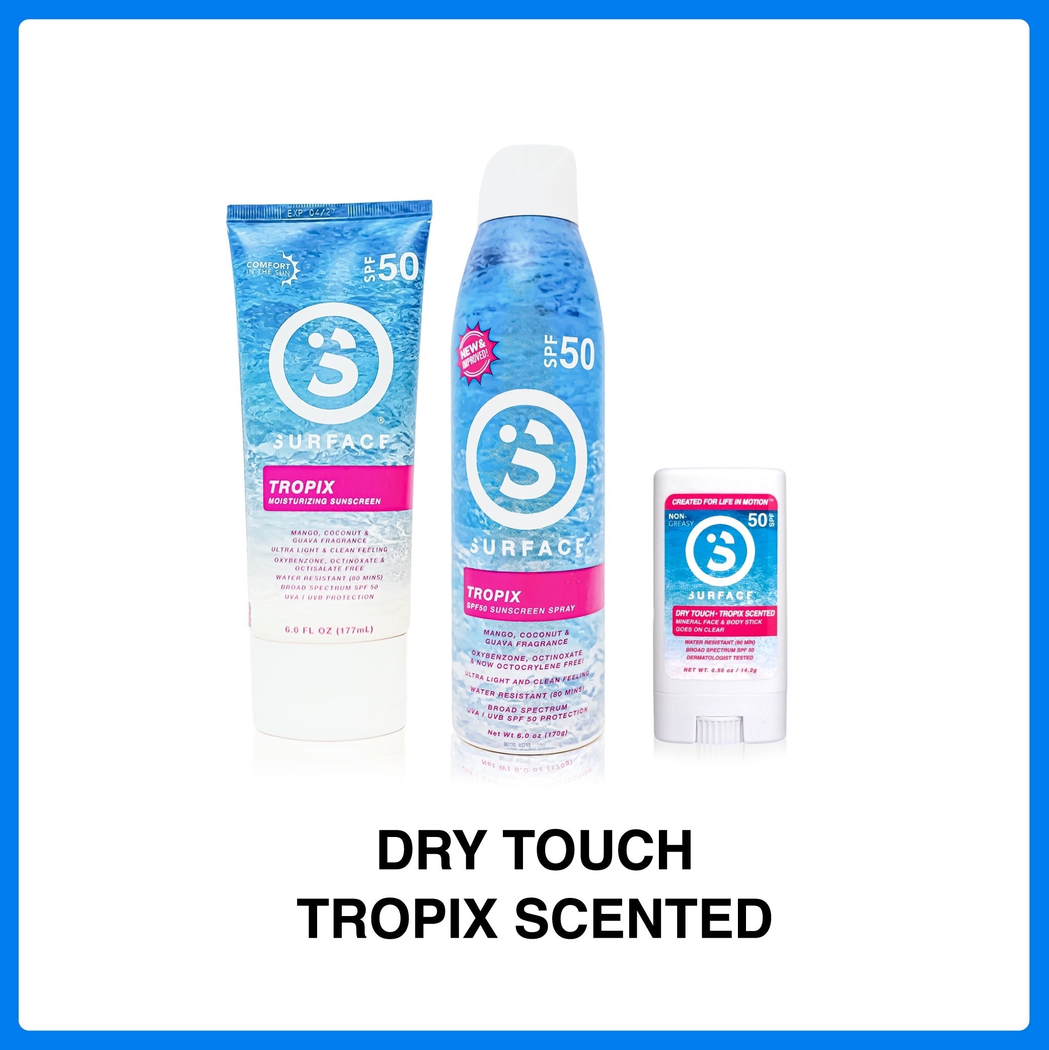 Some products, like the Sheer Touch SPF50 Spray, feature a pleasant "TROPIX" fragrance, while others, such as the Dry Touch SPF50 Spray, are fragrance-free.