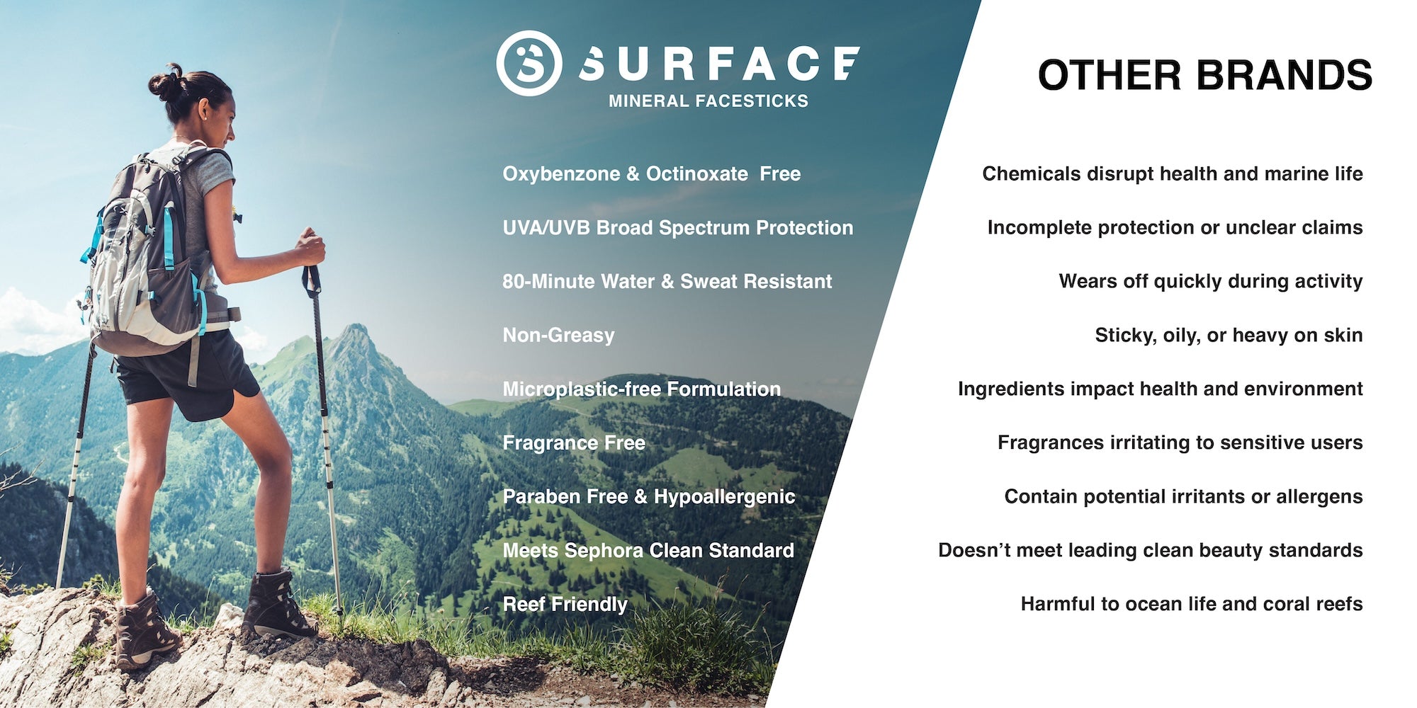 Surface Mineral sunscreens are powered by non-nano zinc oxide to provide broad-spectrum UVA/UVB protection without harsh chemical filters. Safe for sensitive skin and reef-friendly, this mineral line is clean, reliable sun protection that stays on your skin—not in your body or the ocean. Our formulations are always microplastic-free.